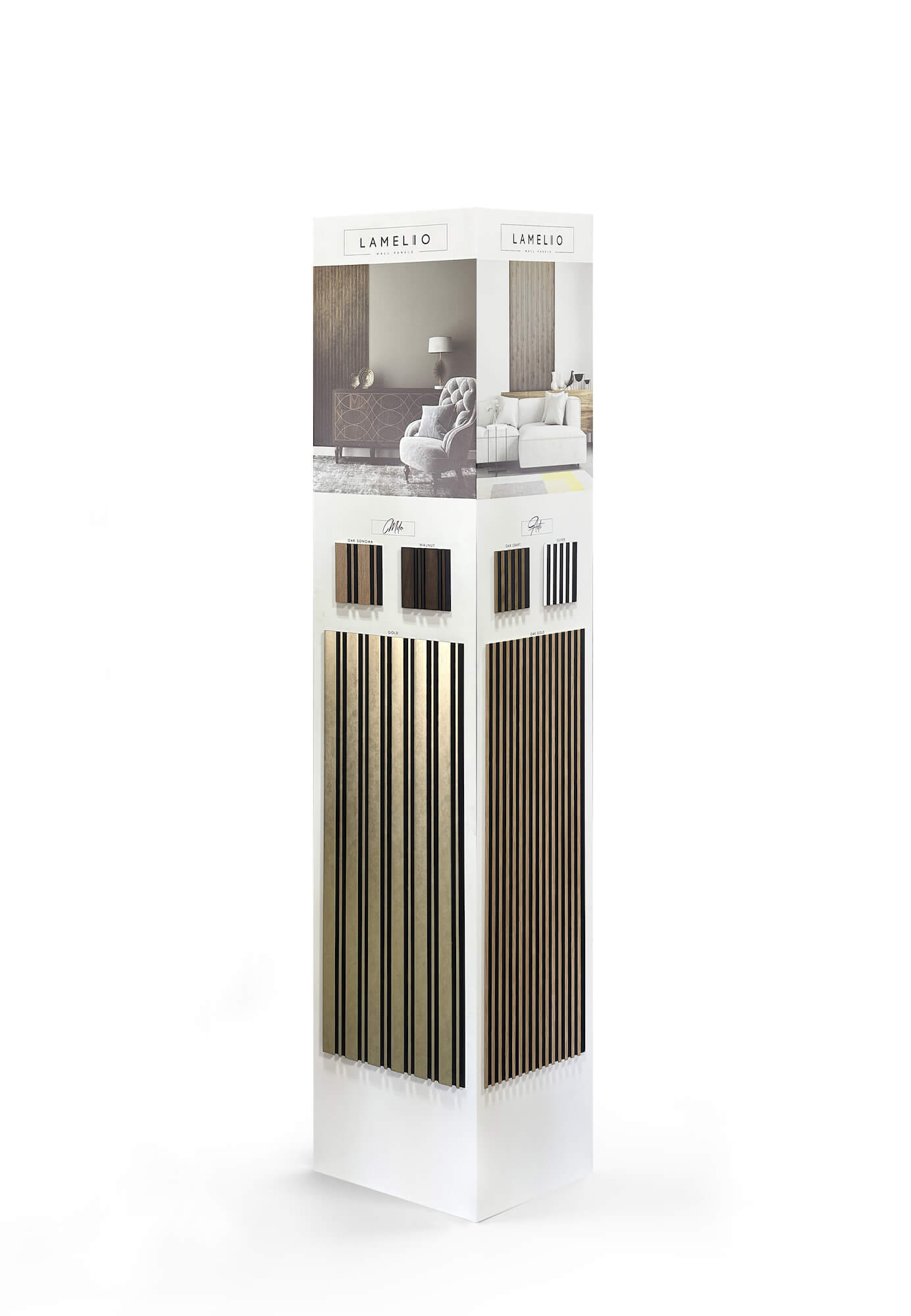The Lamelio Expo Tower is an innovative presentation solution standing at 195 cm tall, perfect for showcasing a collection of wall panels. This exhibit is placed on a rotating base with a diameter of 60 cm, allowing for easy rotation to display the entire product range. The practical use of the rotating base significantly enhances the functionality of the stand by providing access to every side of the display without the need to move around it, which is exceptionally useful in limited exhibition spaces.
