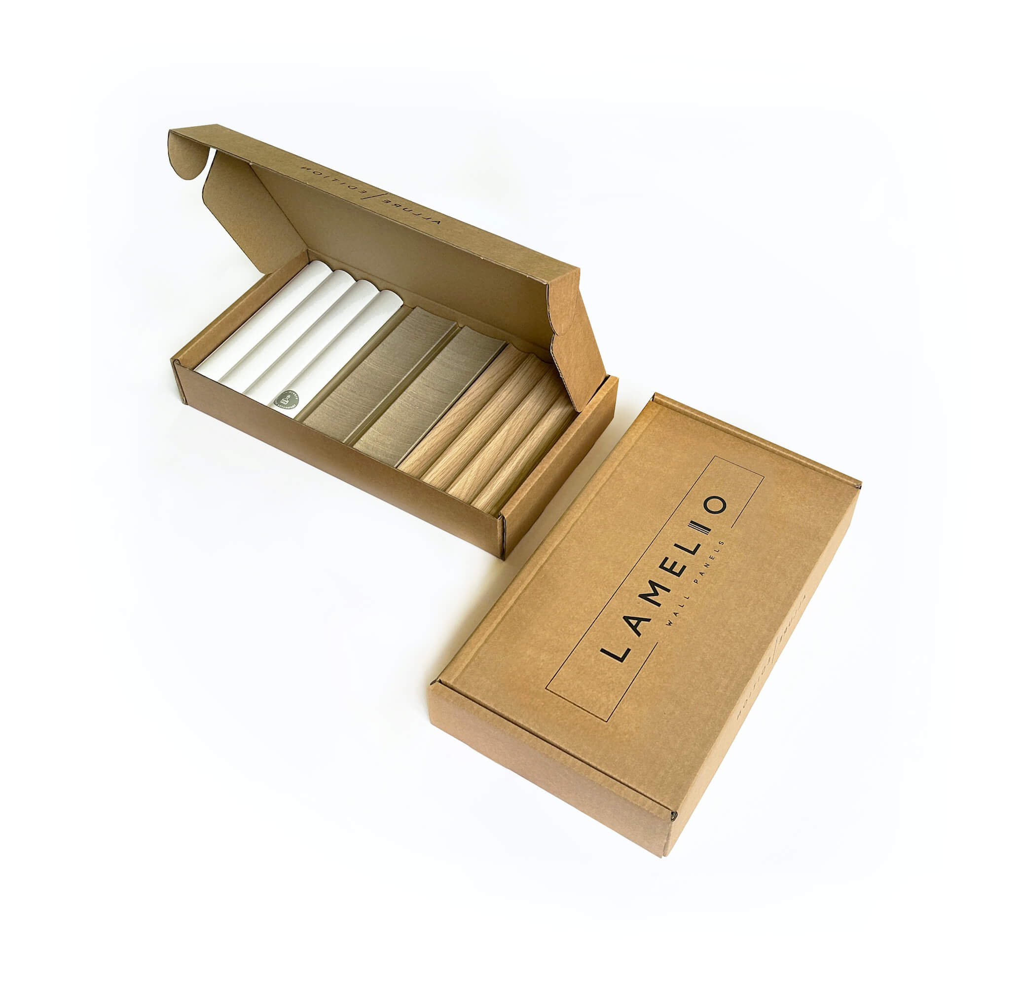 The Lamelio Sample Box Basic is a practical and aesthetically pleasing solution for showcasing standard wall panel samples. The simple, eco-friendly design of the box, adorned with the prominent Lamelio logo on the top, highlights the brand and facilitates identification. Inside, a row of neatly arranged samples can be easily removed and compared, offering clients and designers a clear picture of the interior matching possibilities. It's an ideal kit for distributors looking to offer sophisticated finishing options in a minimalist fashion.
